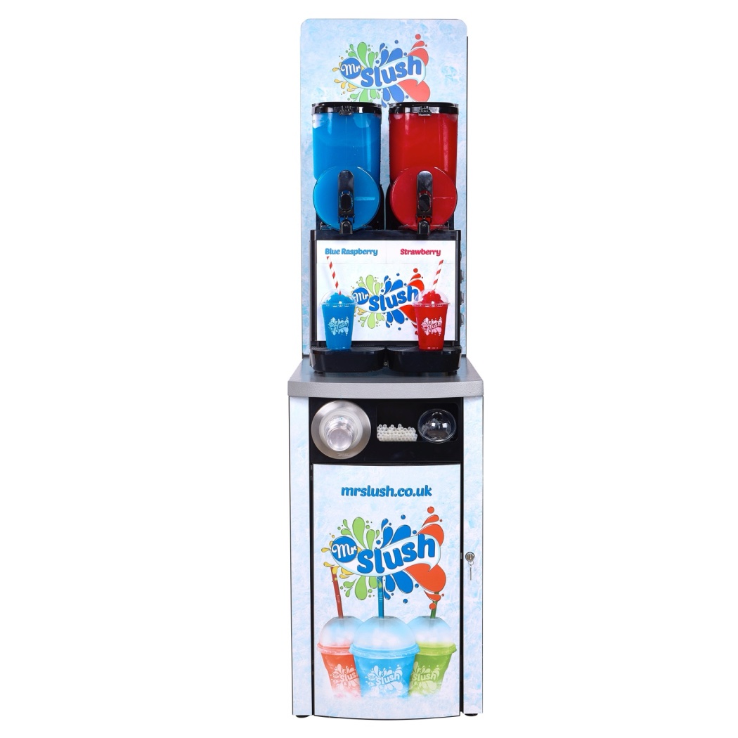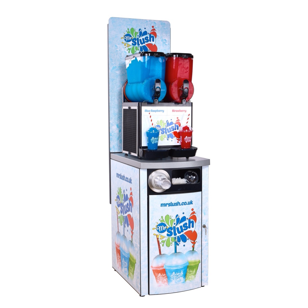 The fully branded Mr Slush Serving Station features a twin-bowl slush machine complete with drinks included, delivering maximum visual impact while measuring just 50cm wide — ideal for space-conscious retail and hospitality environments.