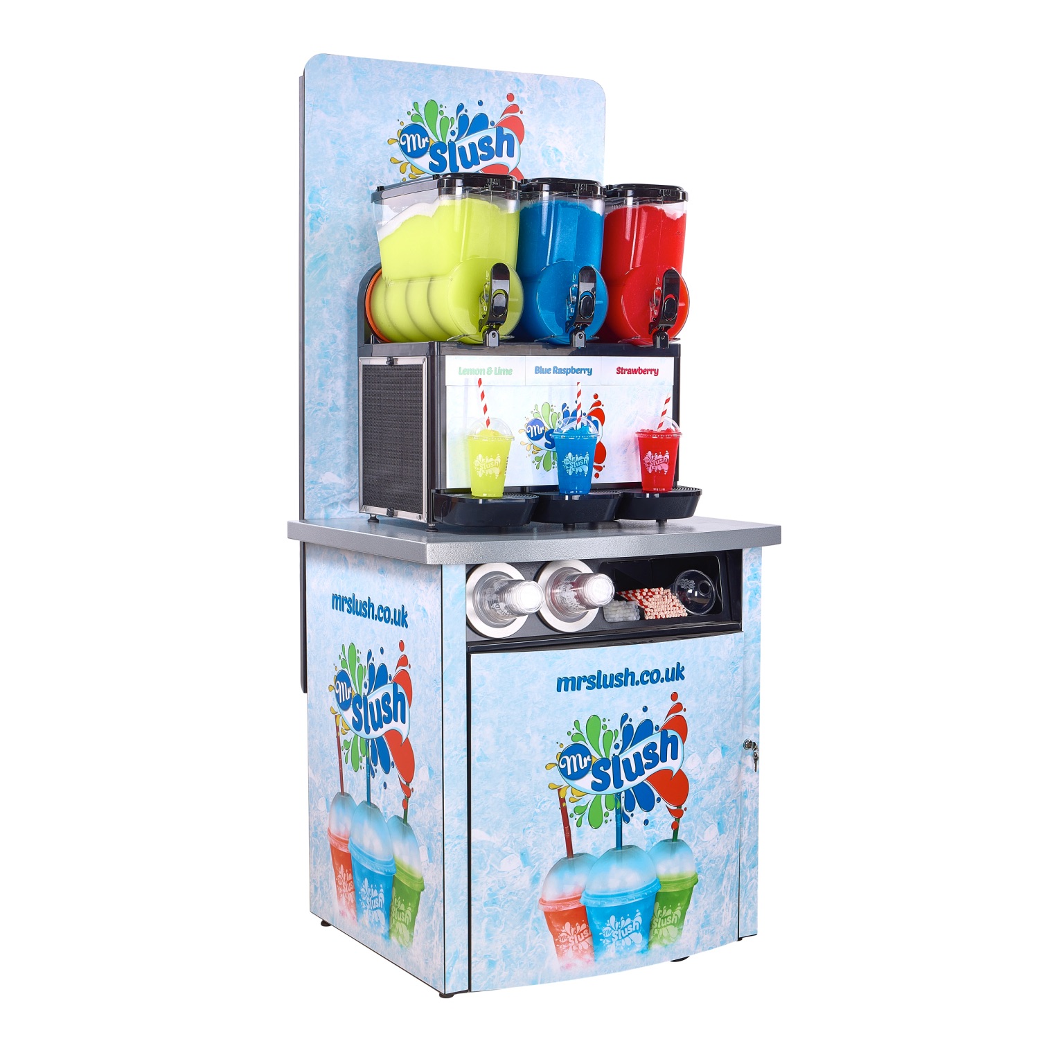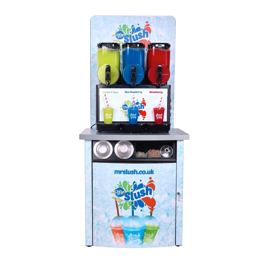 The fully branded Mr Slush Serving Station features a triple-bowl slush machine complete with drinks included, delivering maximum visual impact while measuring just 50cm wide — ideal for space-conscious retail and hospitality environments.